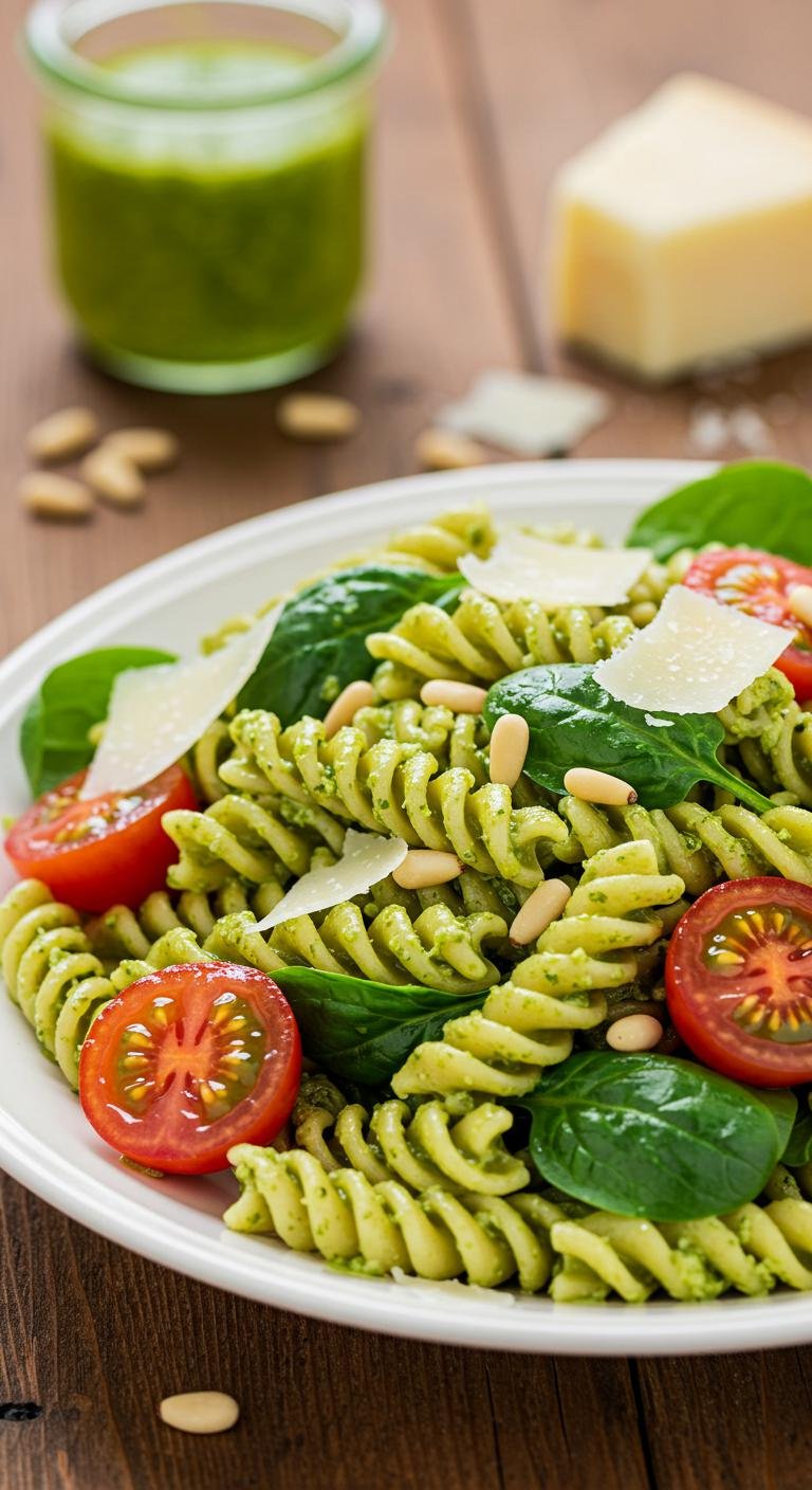 - In a large bowl, mix pasta, pesto, tomatoes, spinach, and pine nuts.