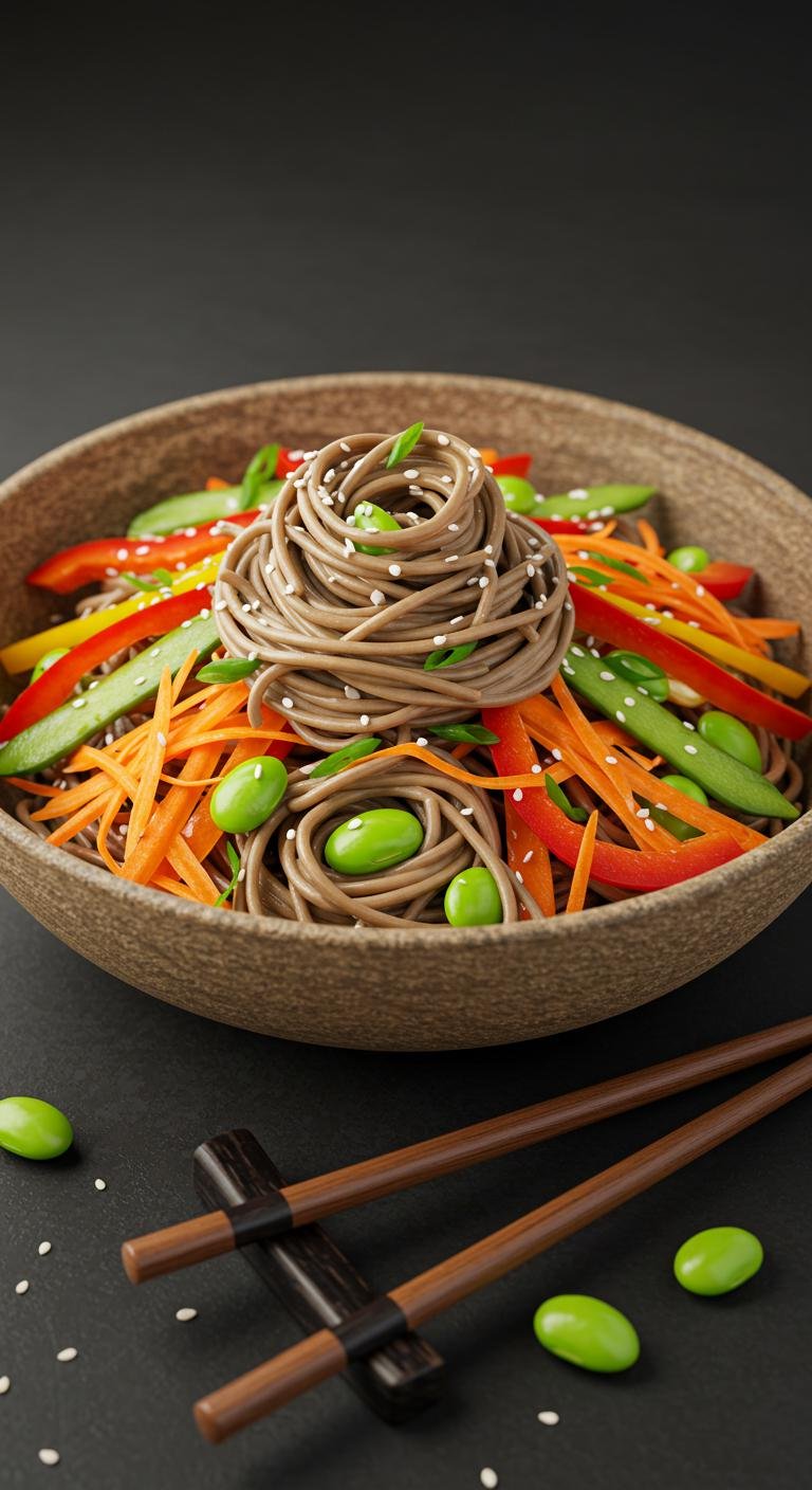 - In a bowl, combine noodles, veggies, and edamame.