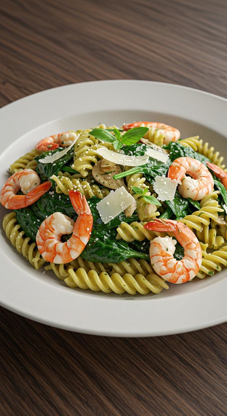 - Sauté garlic in olive oil, add shrimp and spinach until cooked.