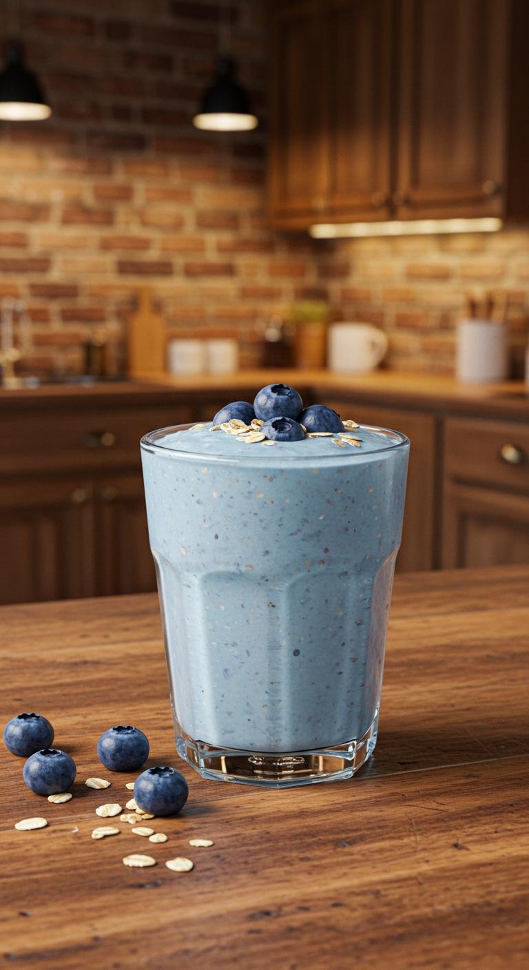 - Blend blueberries, protein powder, oats, milk, and ice until creamy.