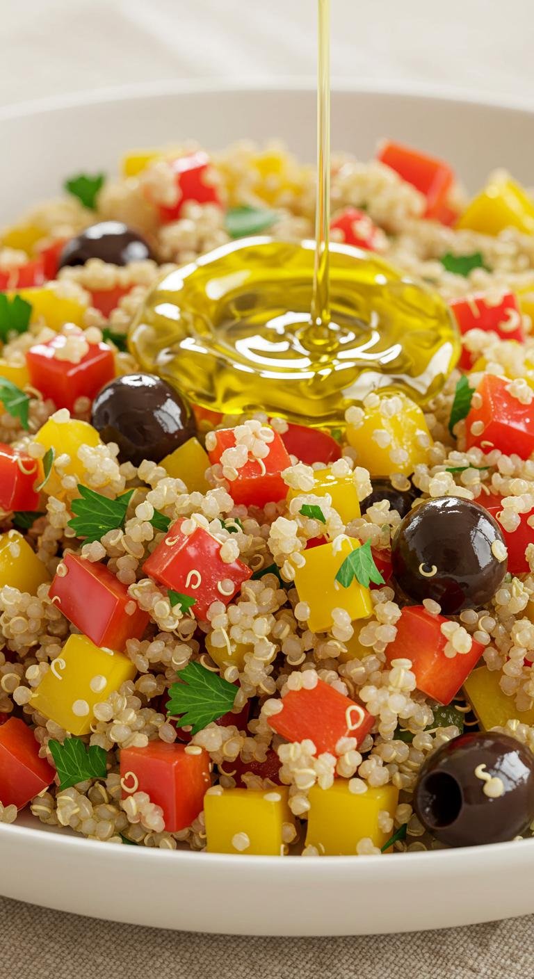 - Add quinoa, olive oil, vinegar, salt, and pepper; mix thoroughly.