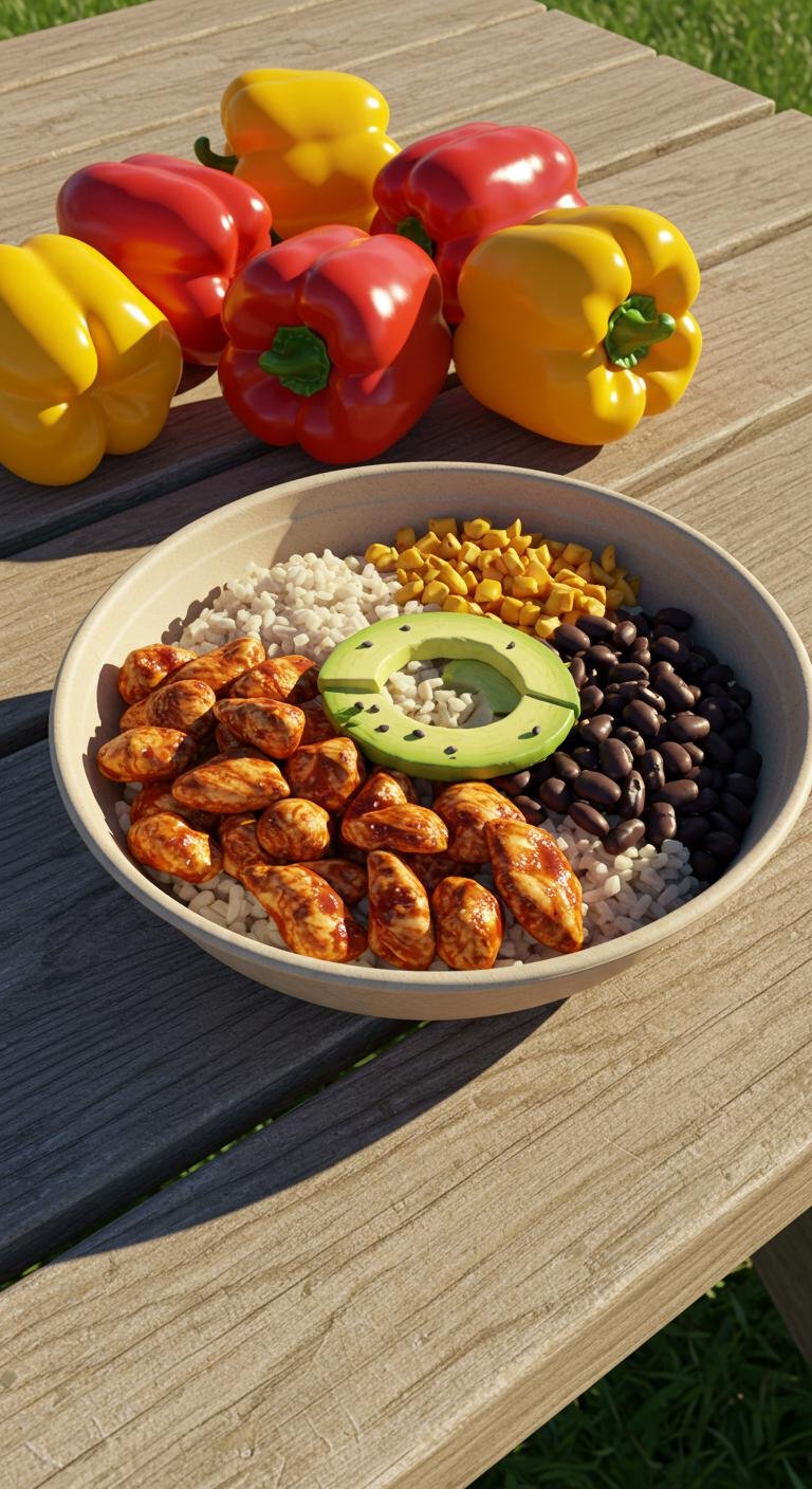 - Layer rice, chicken, black beans, and avocado in a bowl.