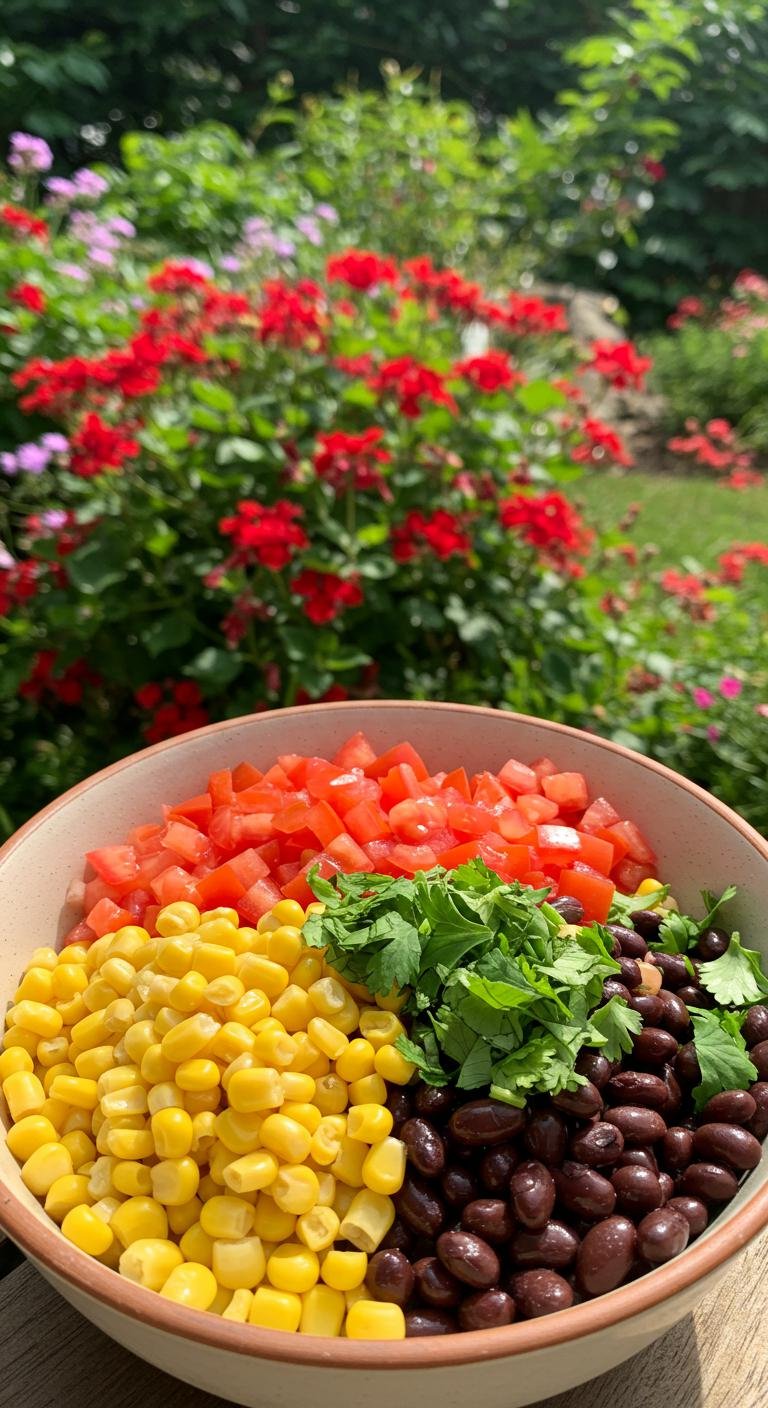 - Combine corn, black beans, and tomatoes in a bowl, squeezing in lime juice.