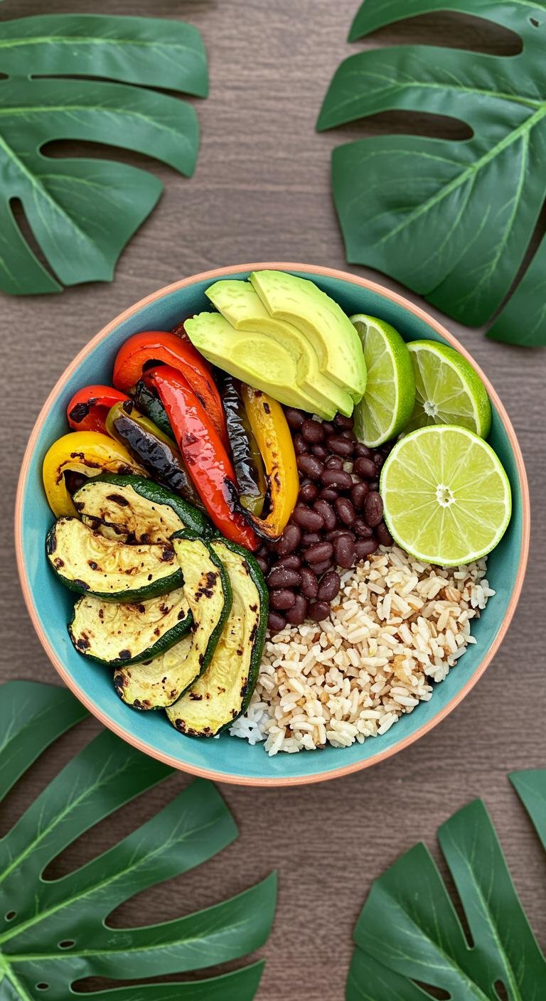 - Assemble quinoa, veggies, and black beans in a bowl, topping with avocado and lime.