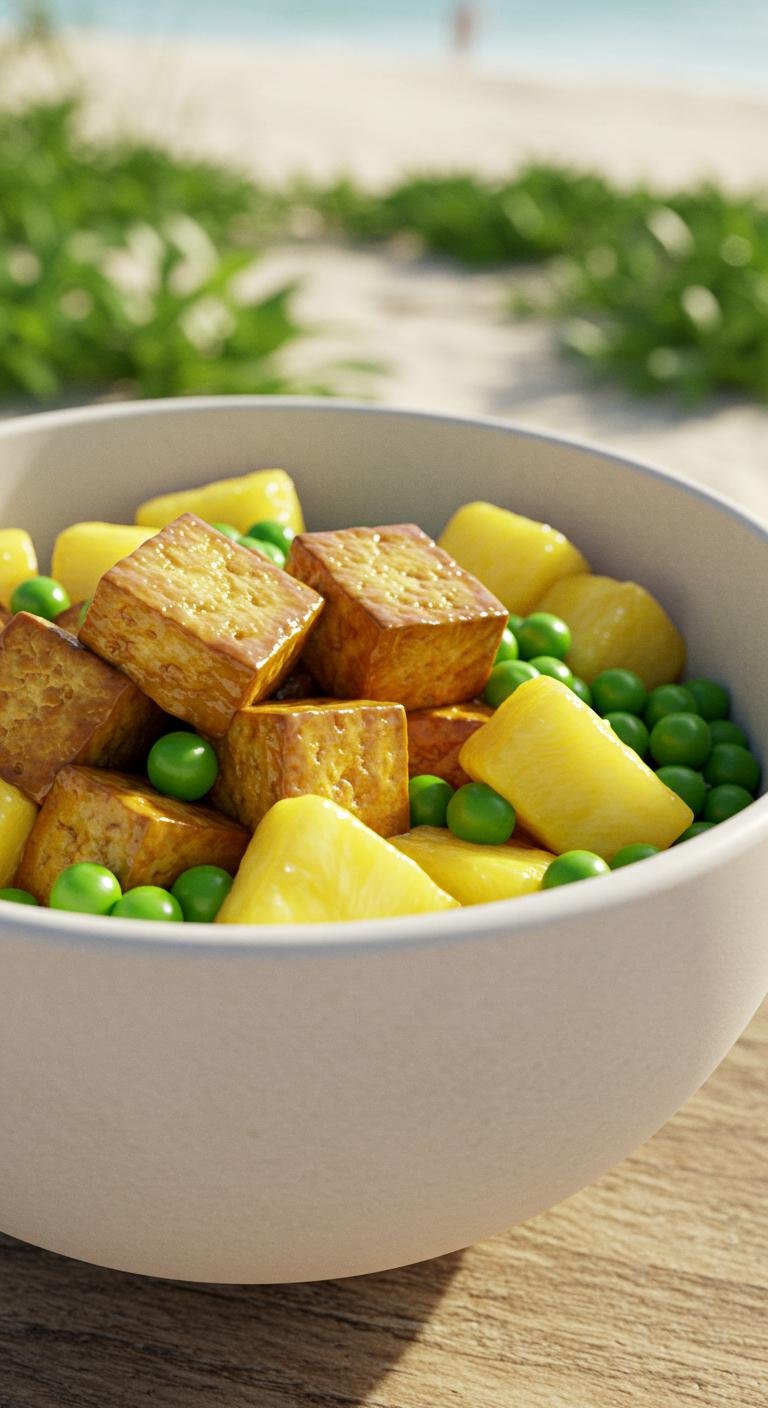 - Sauté tofu until crispy, then add pineapple and green peas until heated through.
