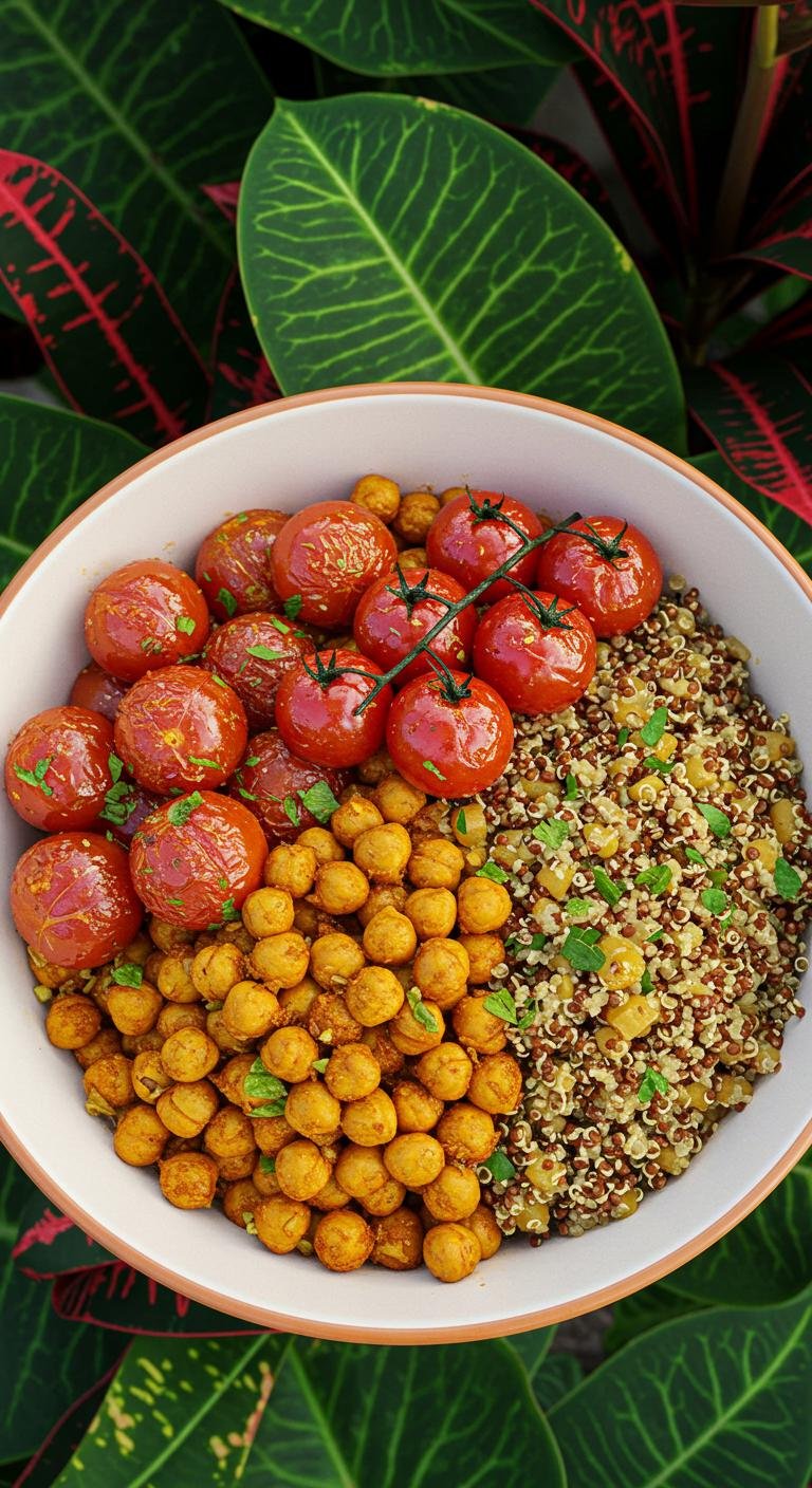 - Toss chickpeas and tomatoes with oil and spices; roast until golden.