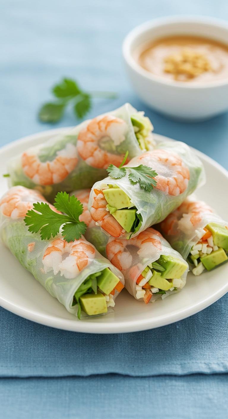 - Layer shrimp, avocado, noodles, and cilantro on rice paper, then roll tightly.
