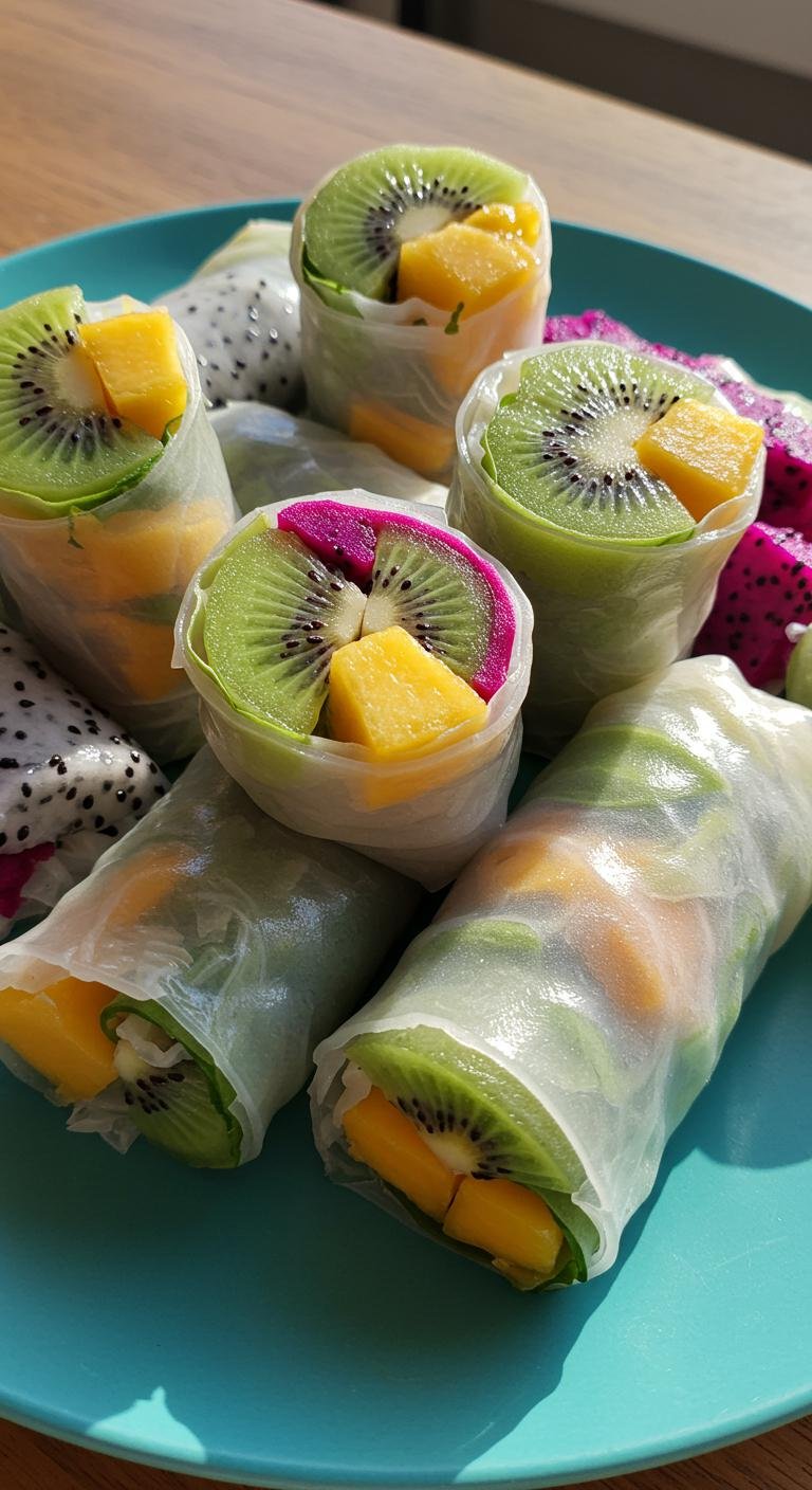 - Fill with kiwi, dragon fruit, and pineapple, then roll tightly.