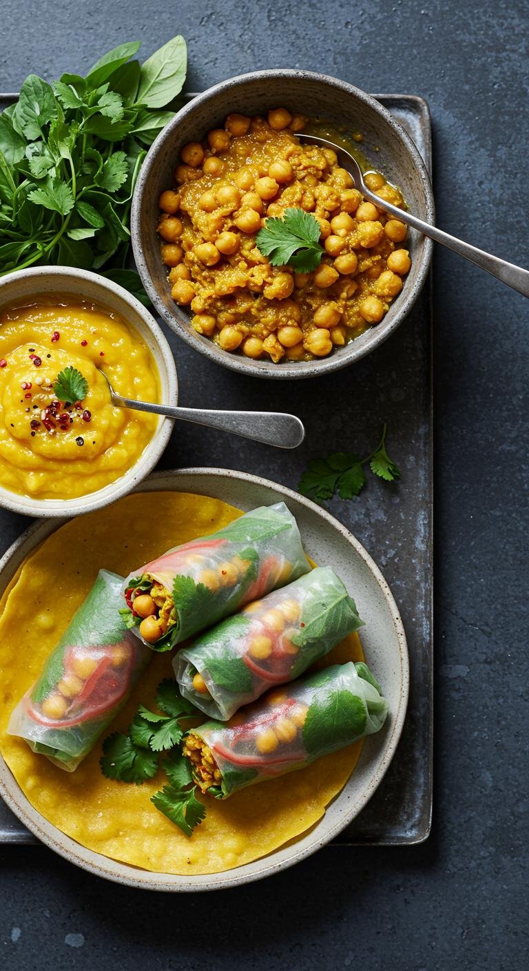 - Mix chickpeas with curry powder, layer with cucumber on the rice paper, then roll tightly.