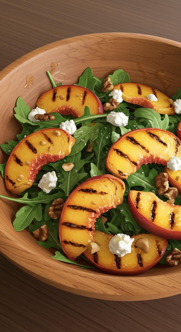 - Assemble arugula, peaches, goat cheese, and walnuts in a bowl.