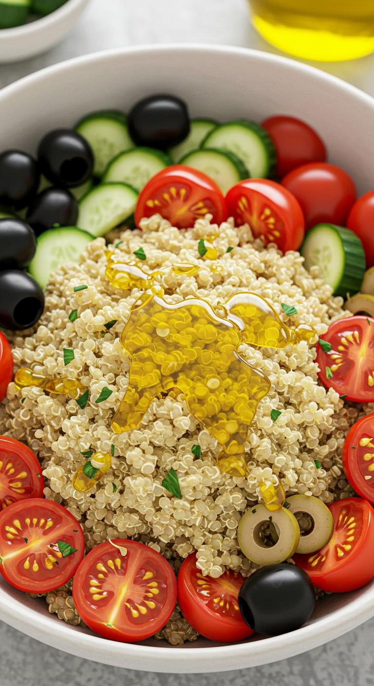 - Top with tomatoes, cucumber, and olives, and drizzle with olive oil.