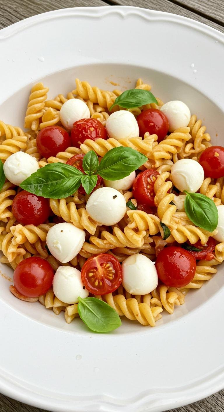 - Toss with mozzarella, tomatoes, and basil in a large bowl.