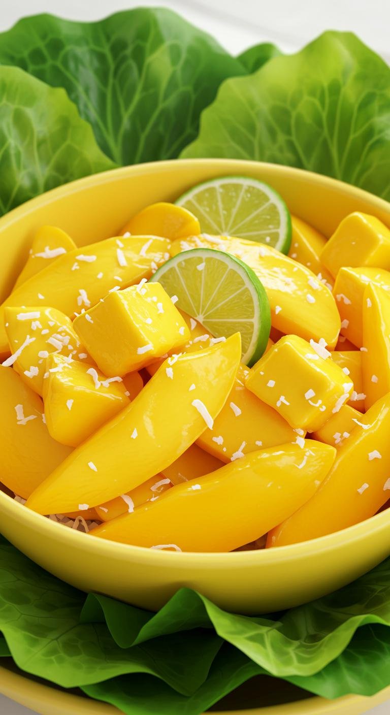 - Top with mango slices and shredded coconut, then drizzle with lime juice.