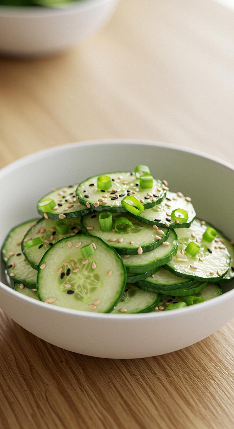 - Toss sliced cucumbers with the sauce and sprinkle with sesame seeds.