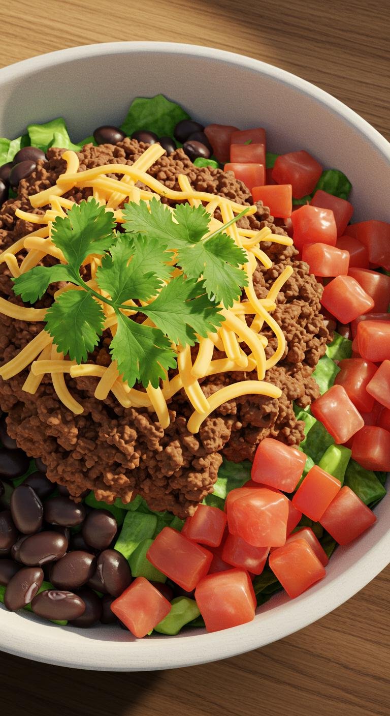 - Layer beef, black beans, cheese, tomatoes, and cilantro in a bowl.