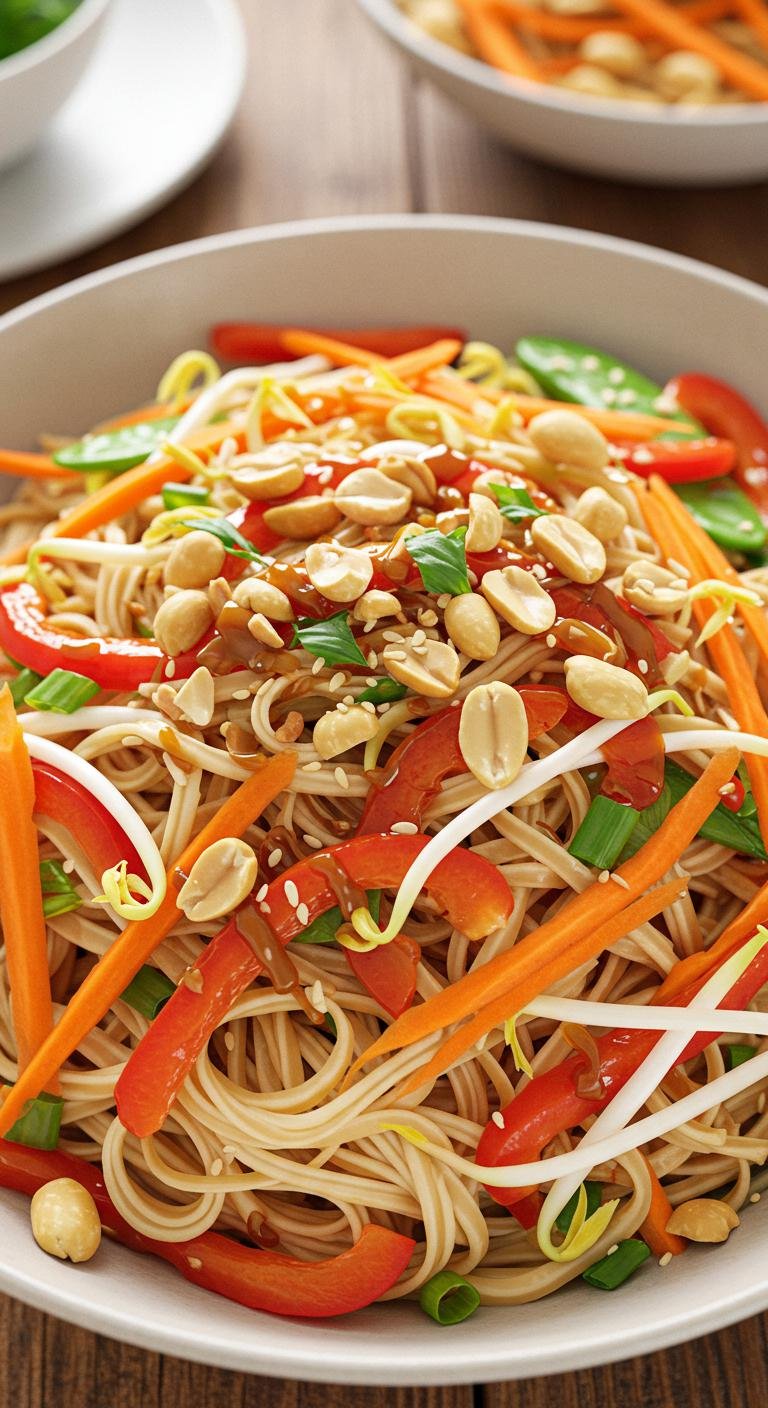 - Toss with bell peppers, carrots, and crushed peanuts.