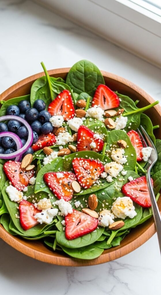 - In a salad bowl, combine spinach, strawberries, and almonds.
