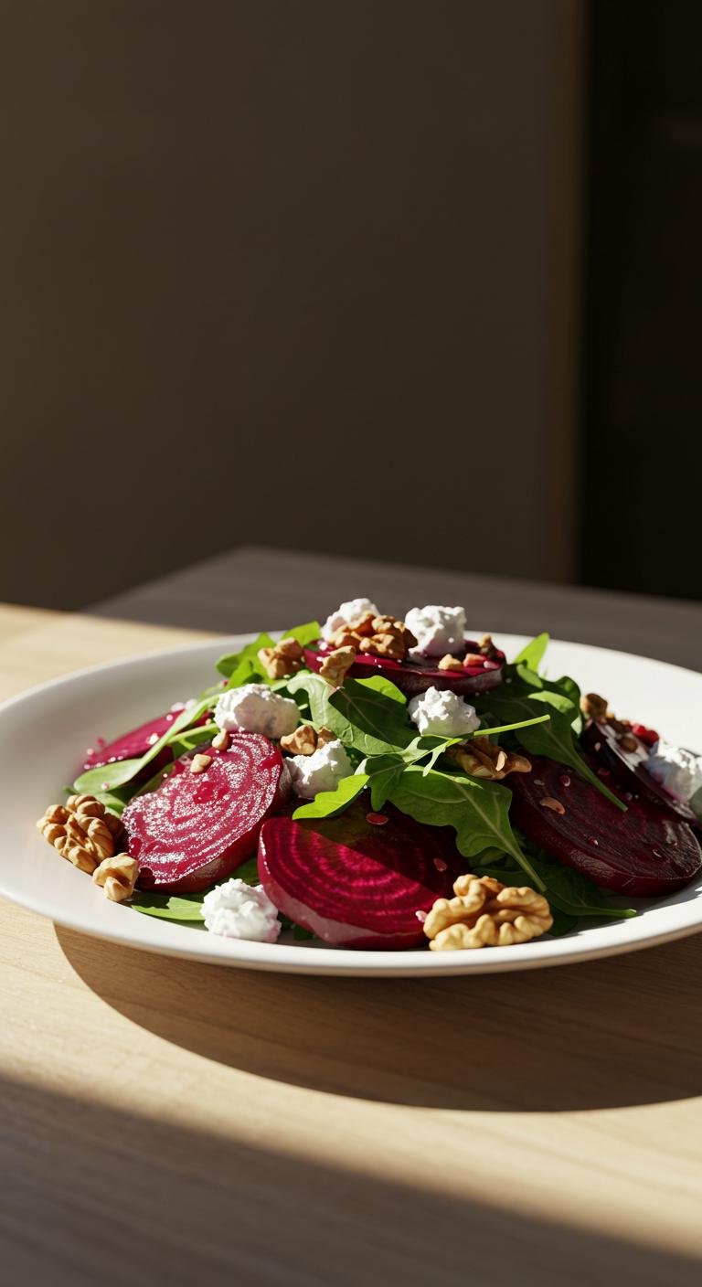 - On a plate, arrange mixed greens and top with beets, goat cheese, and walnuts.