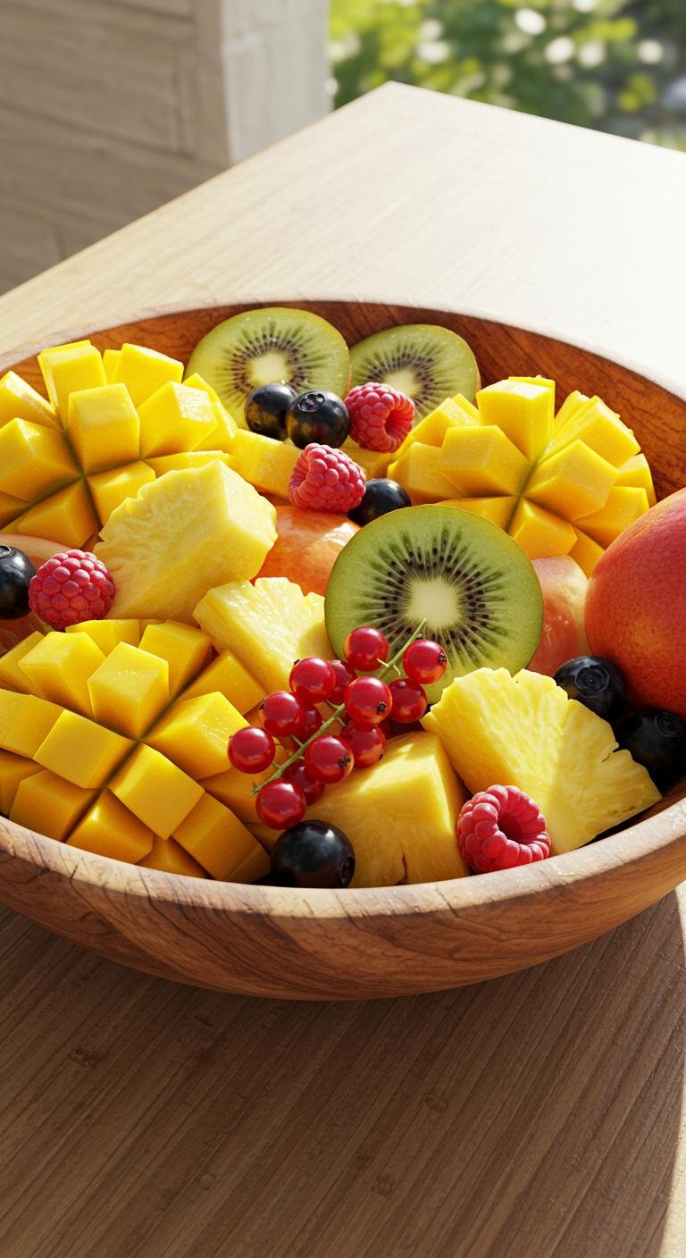 - Combine all chopped fruits in a bowl.