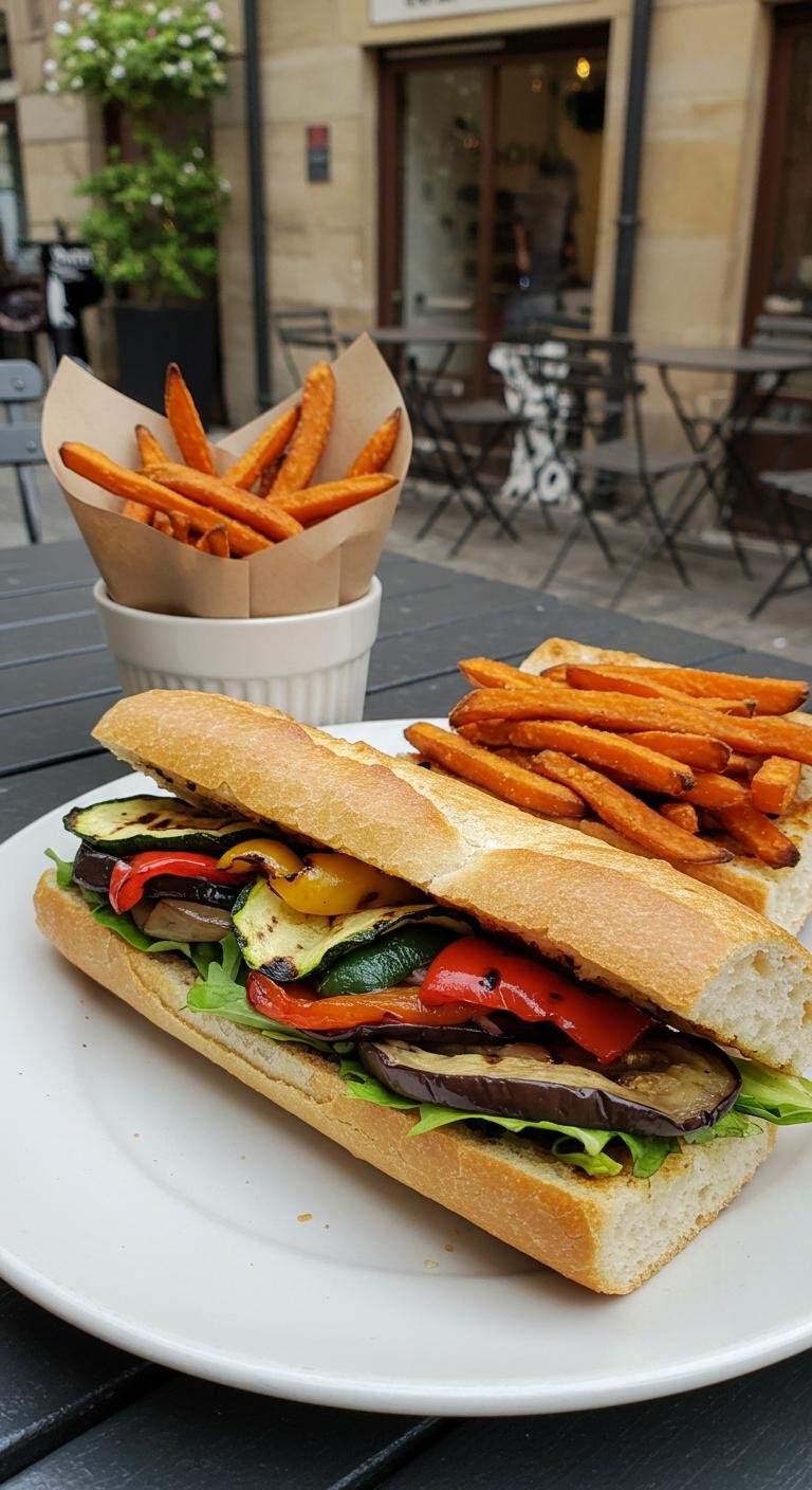 - Slice the baguette and layer in the grilled veggies.