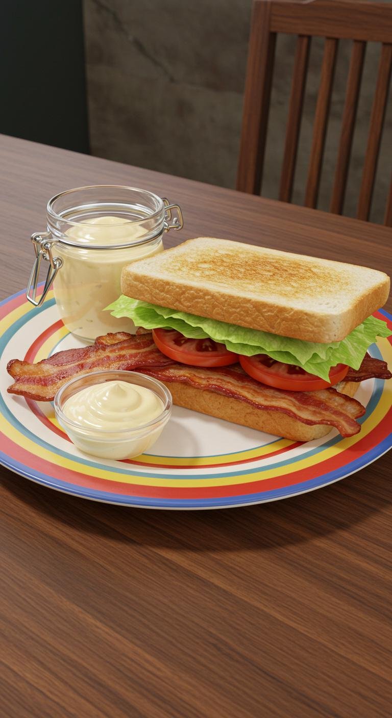 - Spread mayonnaise on one slice of bread and layer with bacon, tomato, and lettuce.