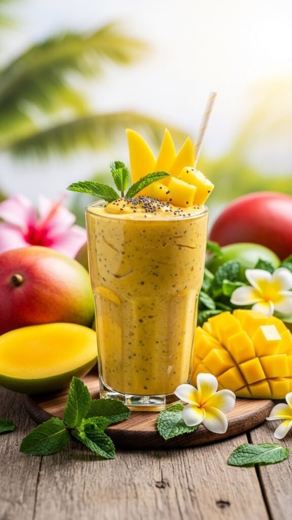 - Blend mango, banana, coconut milk, and lime juice until smooth.