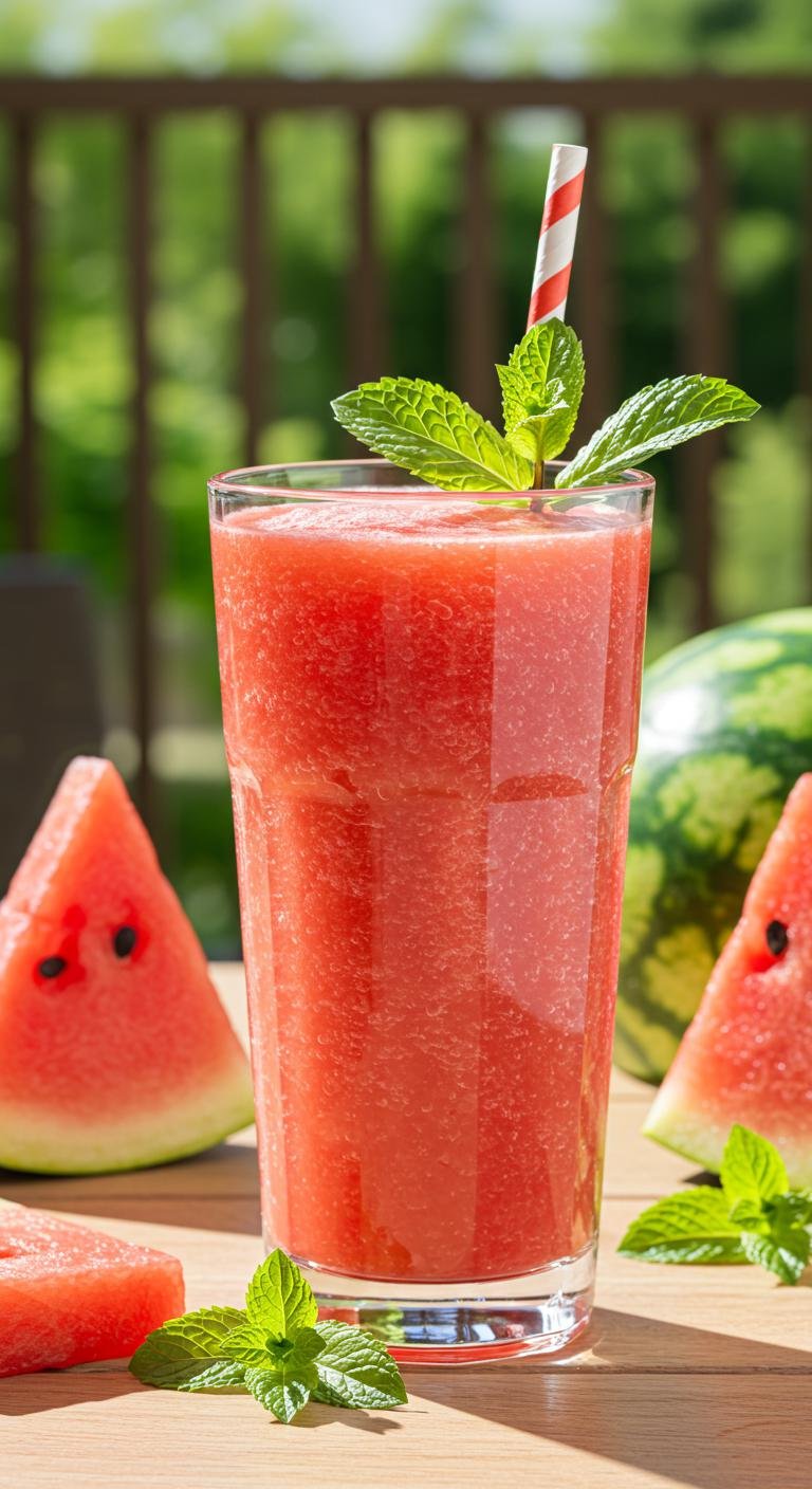 - Blend watermelon, coconut water, mint, and lime juice until smooth.
