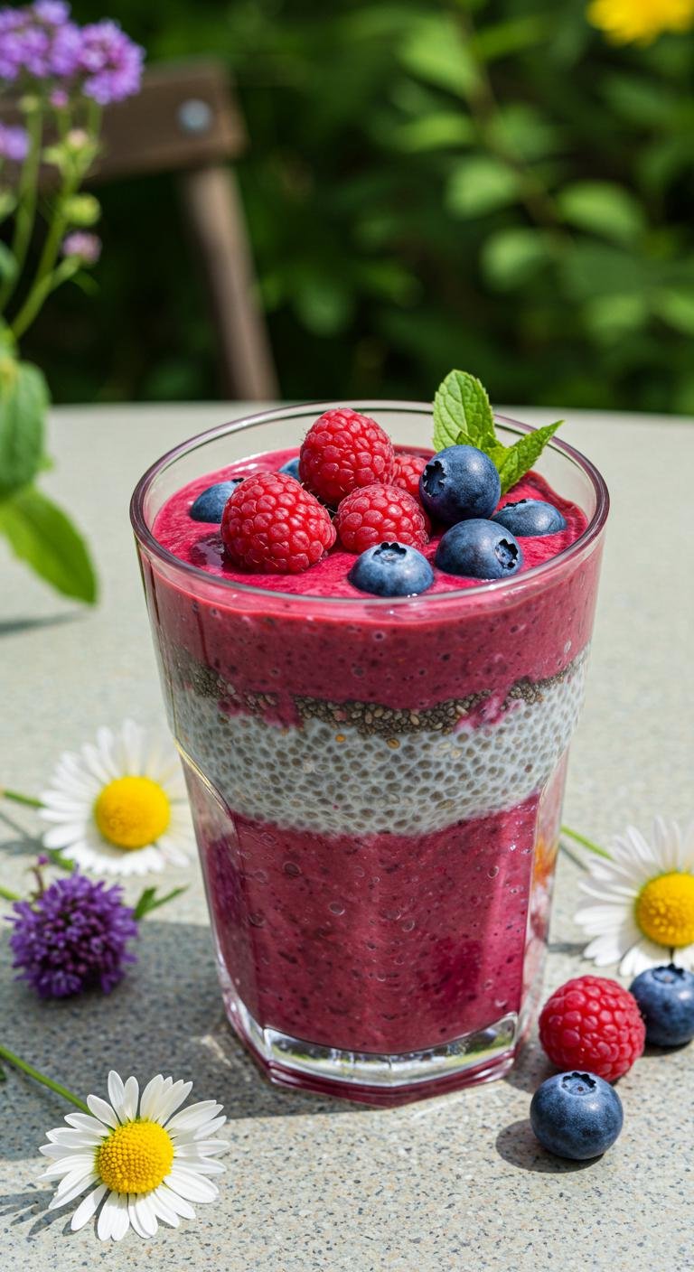 - Blend berries, banana, chia seeds, and almond milk until smooth.