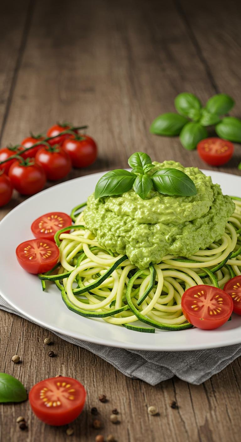 - Toss the zucchini noodles in the avocado pesto until coated.