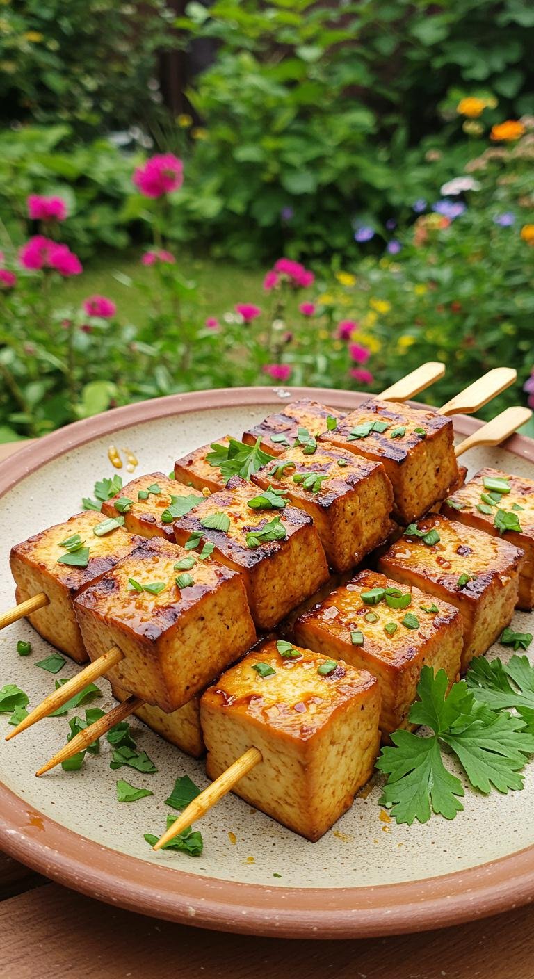 - Marinate tofu cubes in soy sauce, maple syrup, garlic, and chili flakes for 30 minutes.