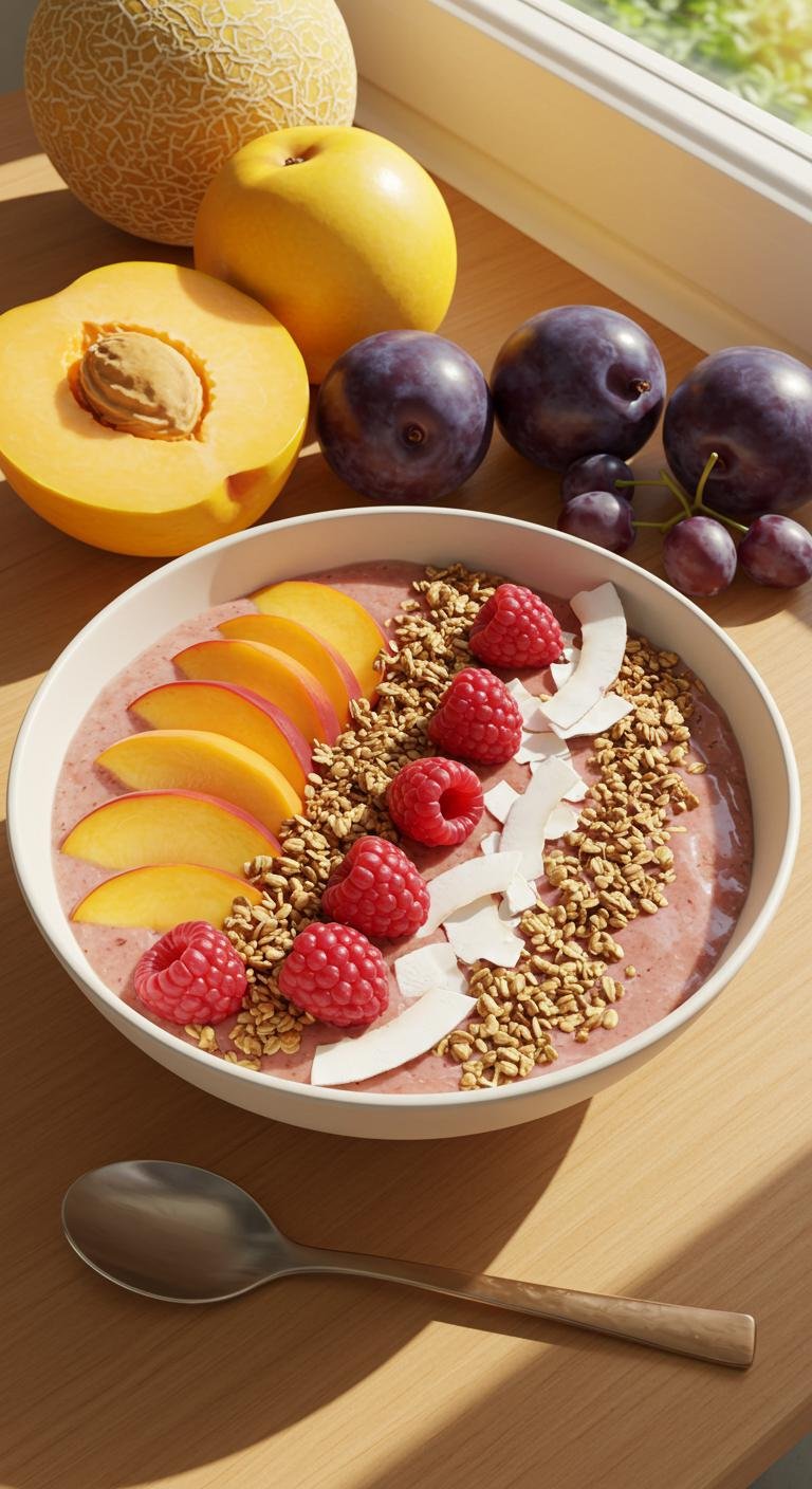 - Blend peaches, raspberries, banana, and almond milk until smooth.