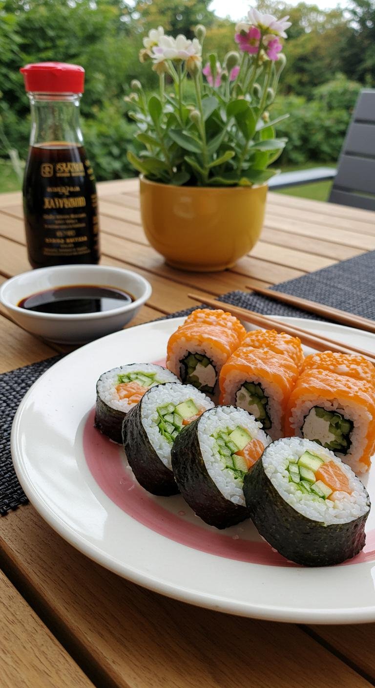 - Lay cucumber and avocado on top, roll tightly, and slice.