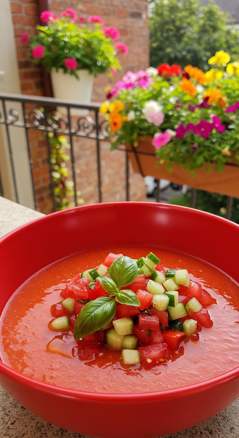 - Blend tomatoes, cucumber, bell pepper, jalapeños, olive oil, salt, and vinegar until smooth.