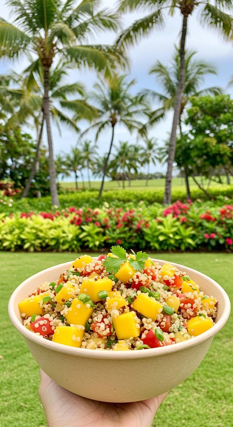 - In a large bowl, mix quinoa, mango, bell pepper, and cilantro.