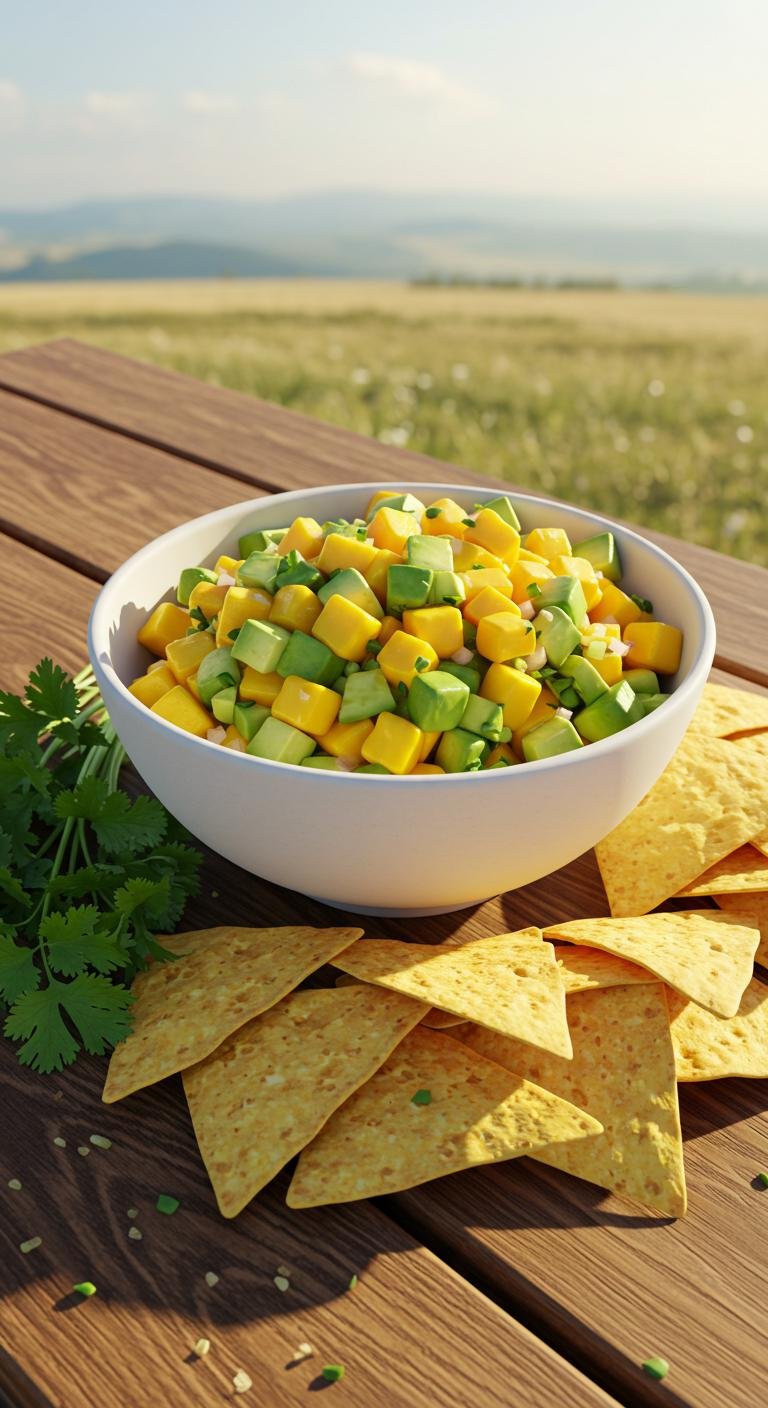 - Combine mango, avocado, onion, lime juice, and salt in a bowl.