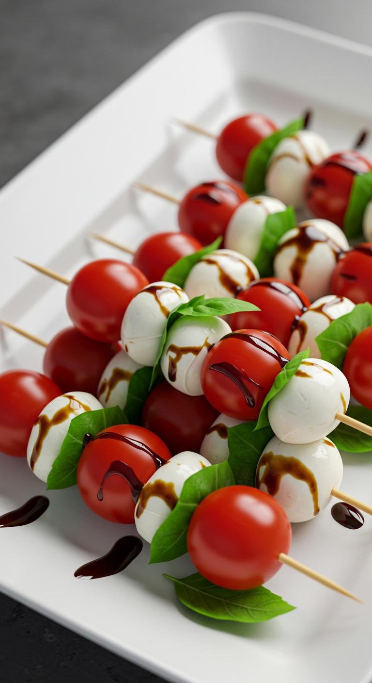 - Thread a cherry tomato, mozzarella ball, and basil leaf onto skewers.