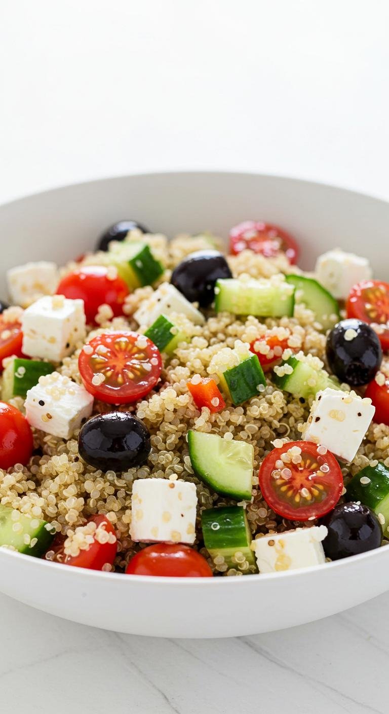 - In a bowl, mix cooked quinoa, tomatoes, cucumber, olives, and feta.