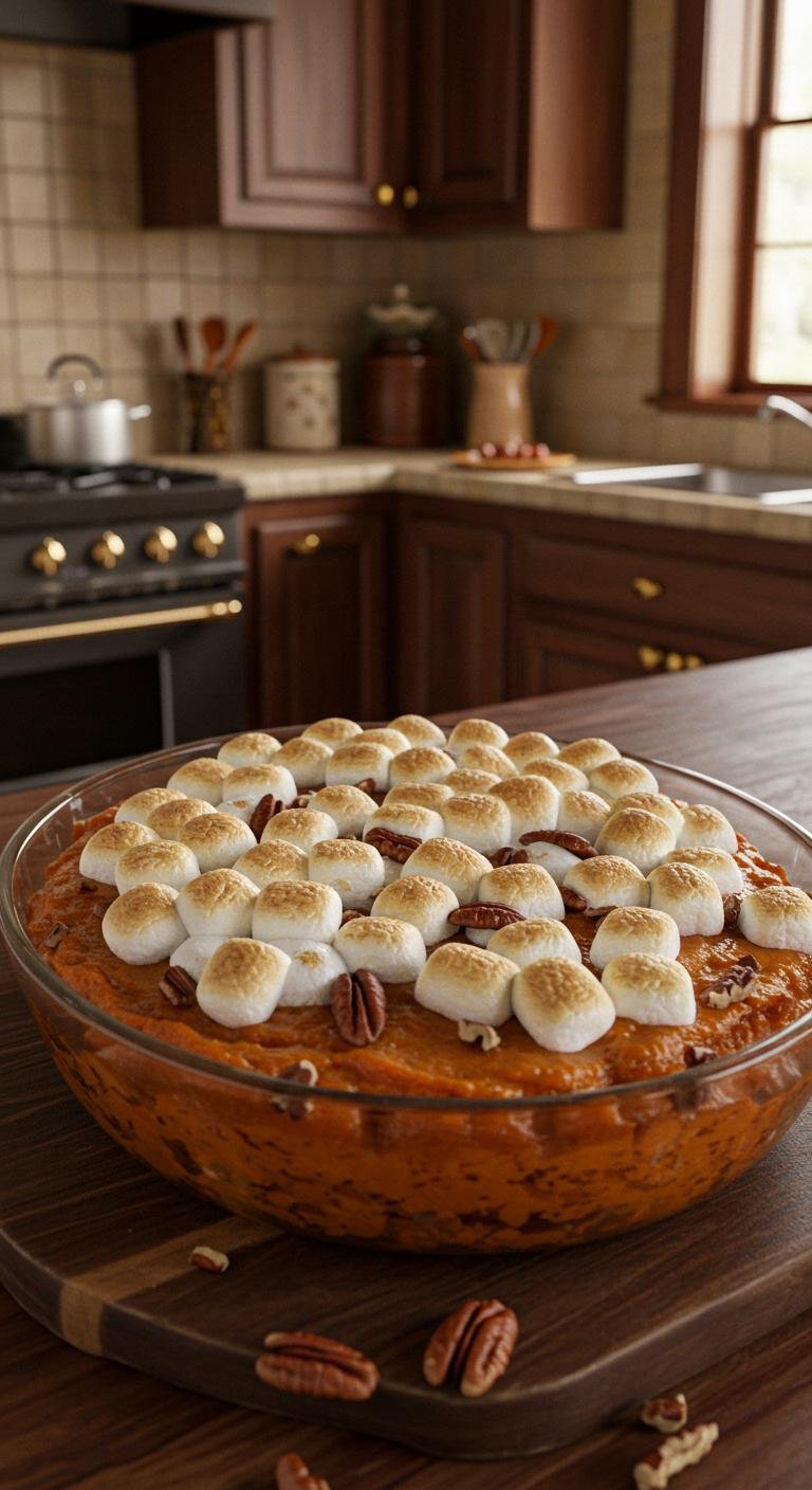 - Transfer to a baking dish and top with marshmallows and pecans.