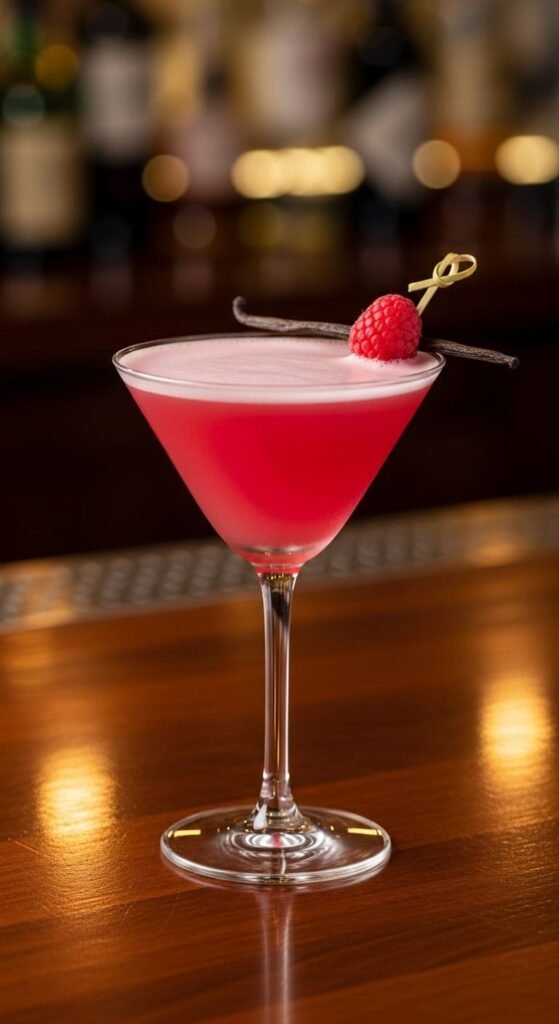 - Shake vodka, triple sec, raspberry puree, and vanilla syrup with ice.