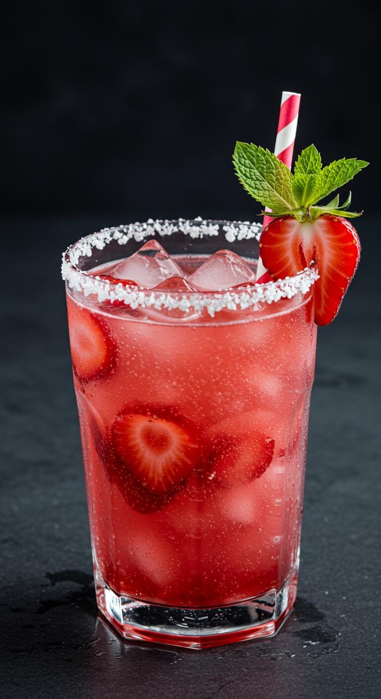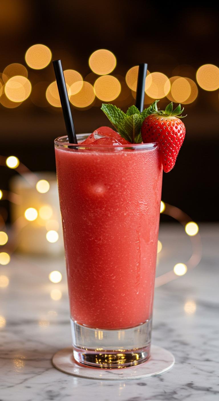 - Blend strawberries, rum, rose syrup, and lime juice until smooth.