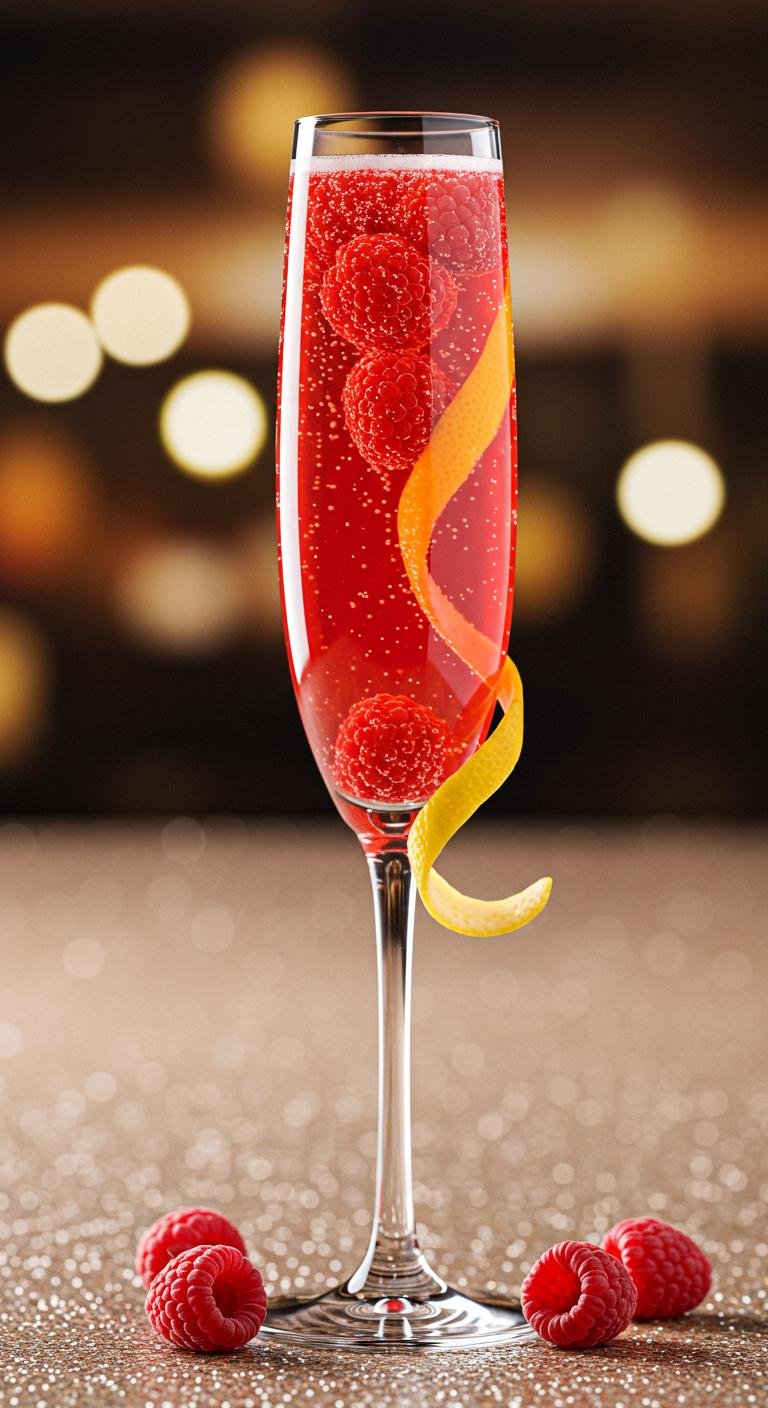 - Pour the raspberry puree and lemon juice into a champagne flute.