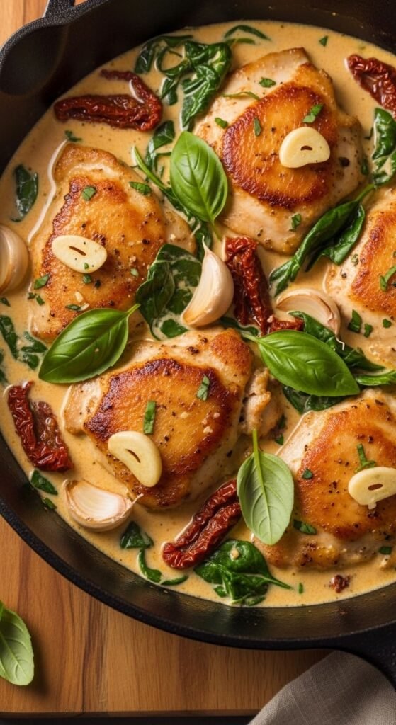 - Add cream, spinach, and tomatoes, simmer until sauce thickens.