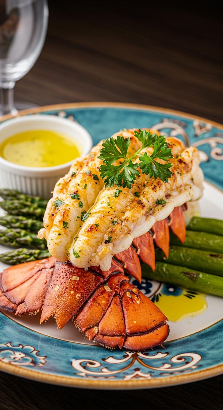 - Cut lobster tails down the center, and brush them with melted butter and lemon juice.