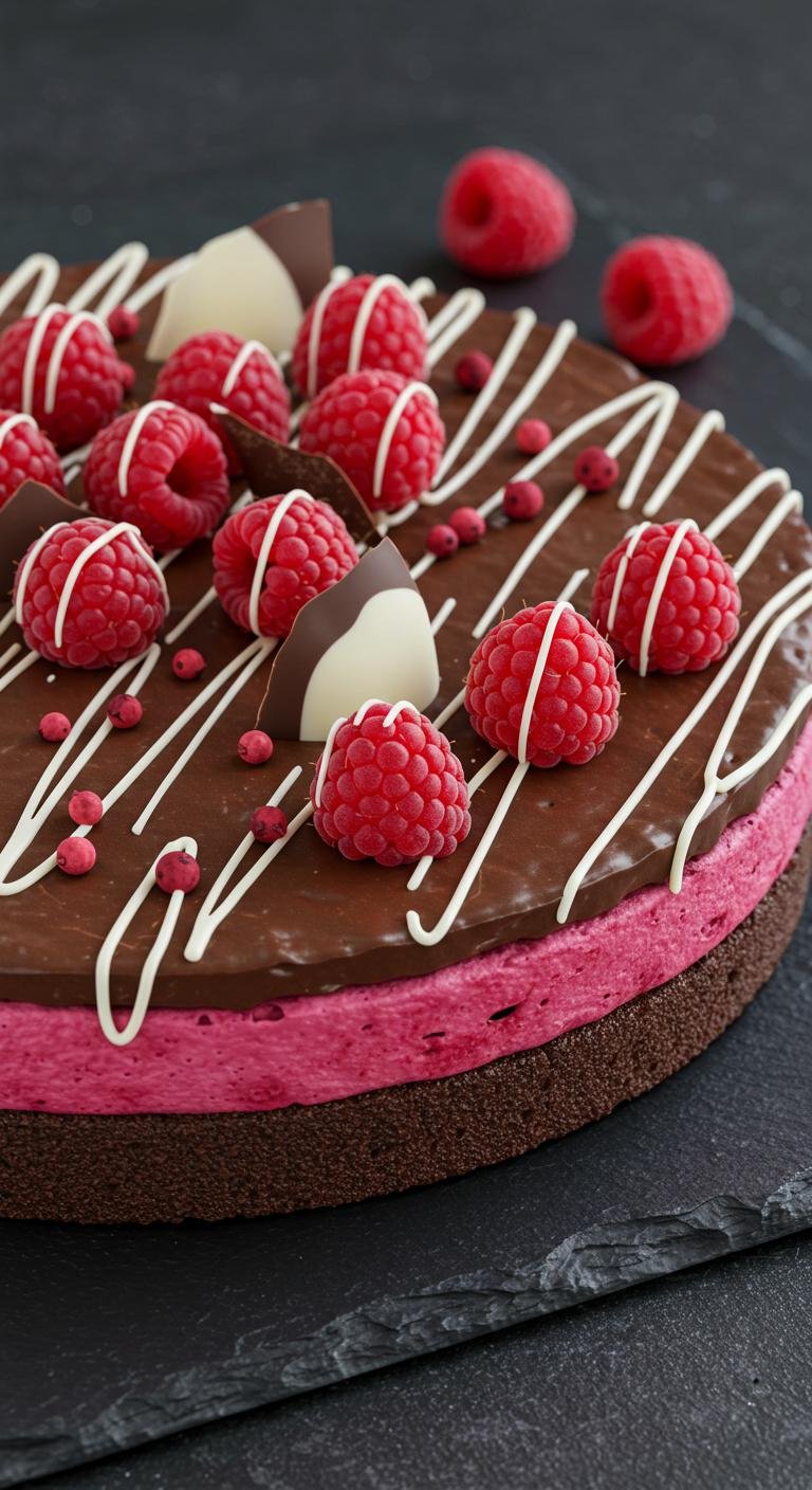 - Pour ganache into the cooled crust, top with raspberries, and chill until set.