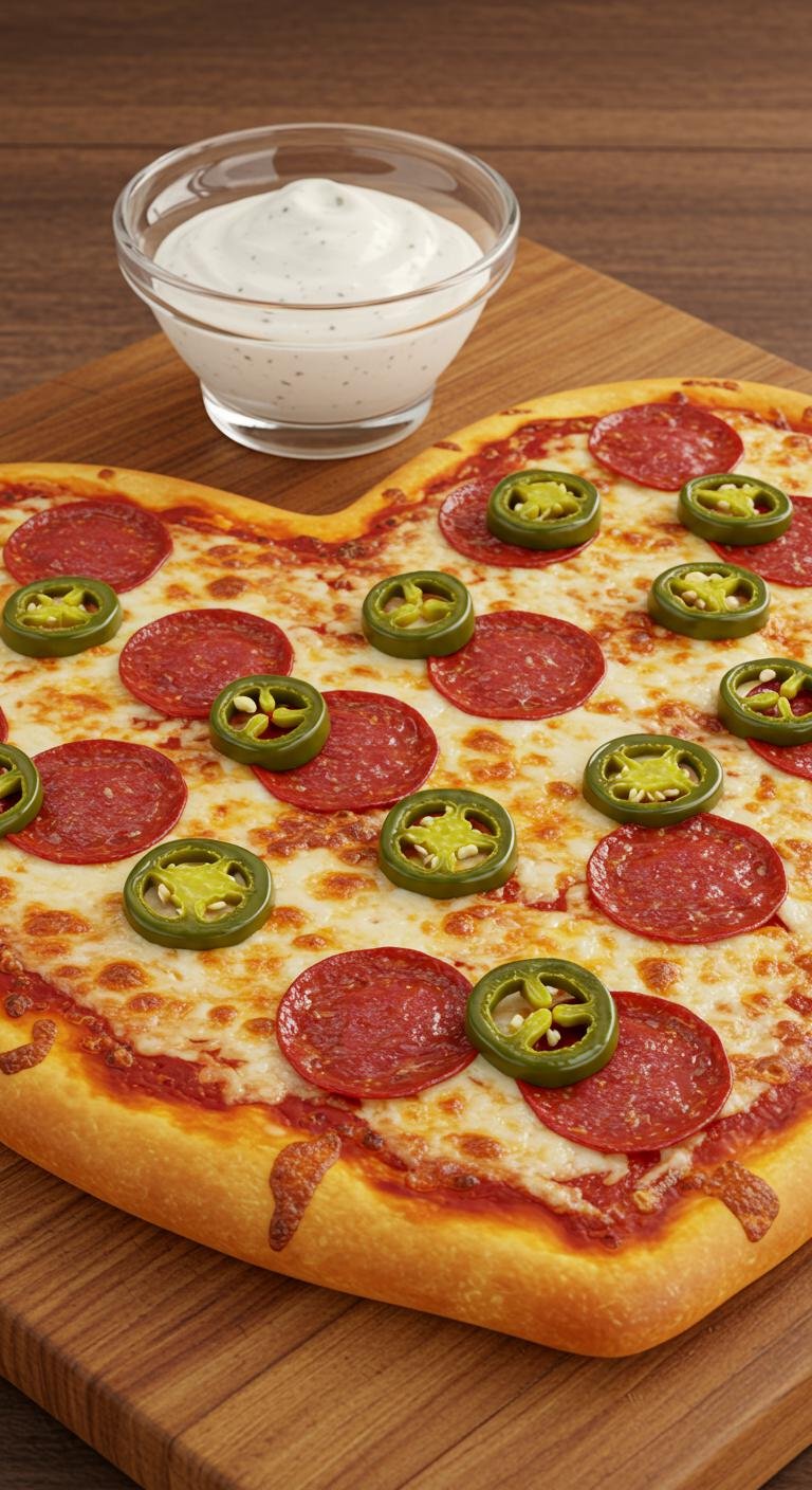 - Roll out the dough into a heart shape and layer sauce, cheese, pepperoni, and jalapeños.