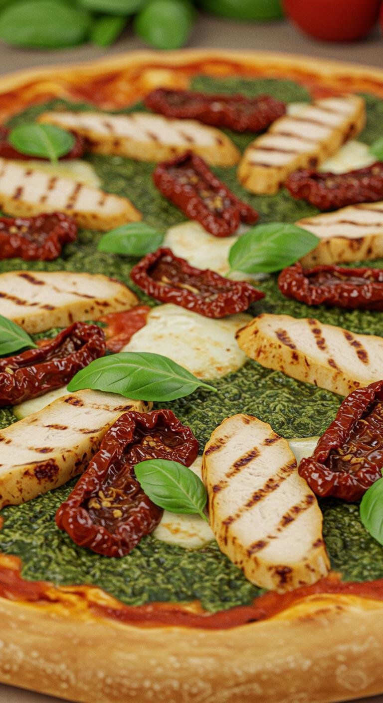 - Spread pesto over the dough and top with chicken and mozzarella.