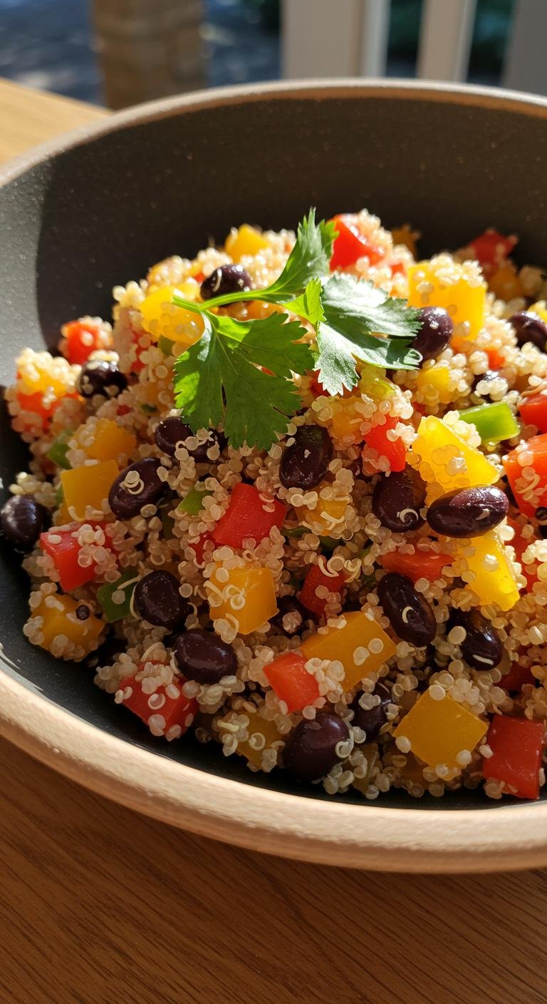 - In a bowl, combine quinoa, black beans, bell pepper, and cilantro.