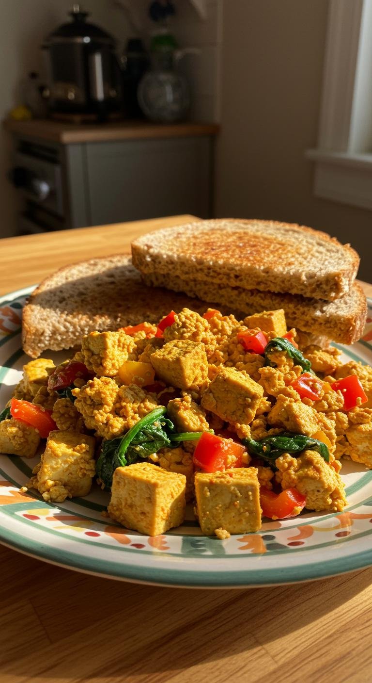 - Sauté bell peppers for 2 minutes, then add crumbled tofu and turmeric.