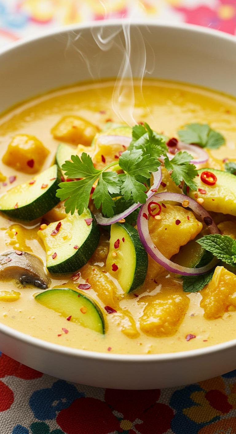 - In a pot, combine coconut milk, vegetable broth, and curry paste; stir to blend.