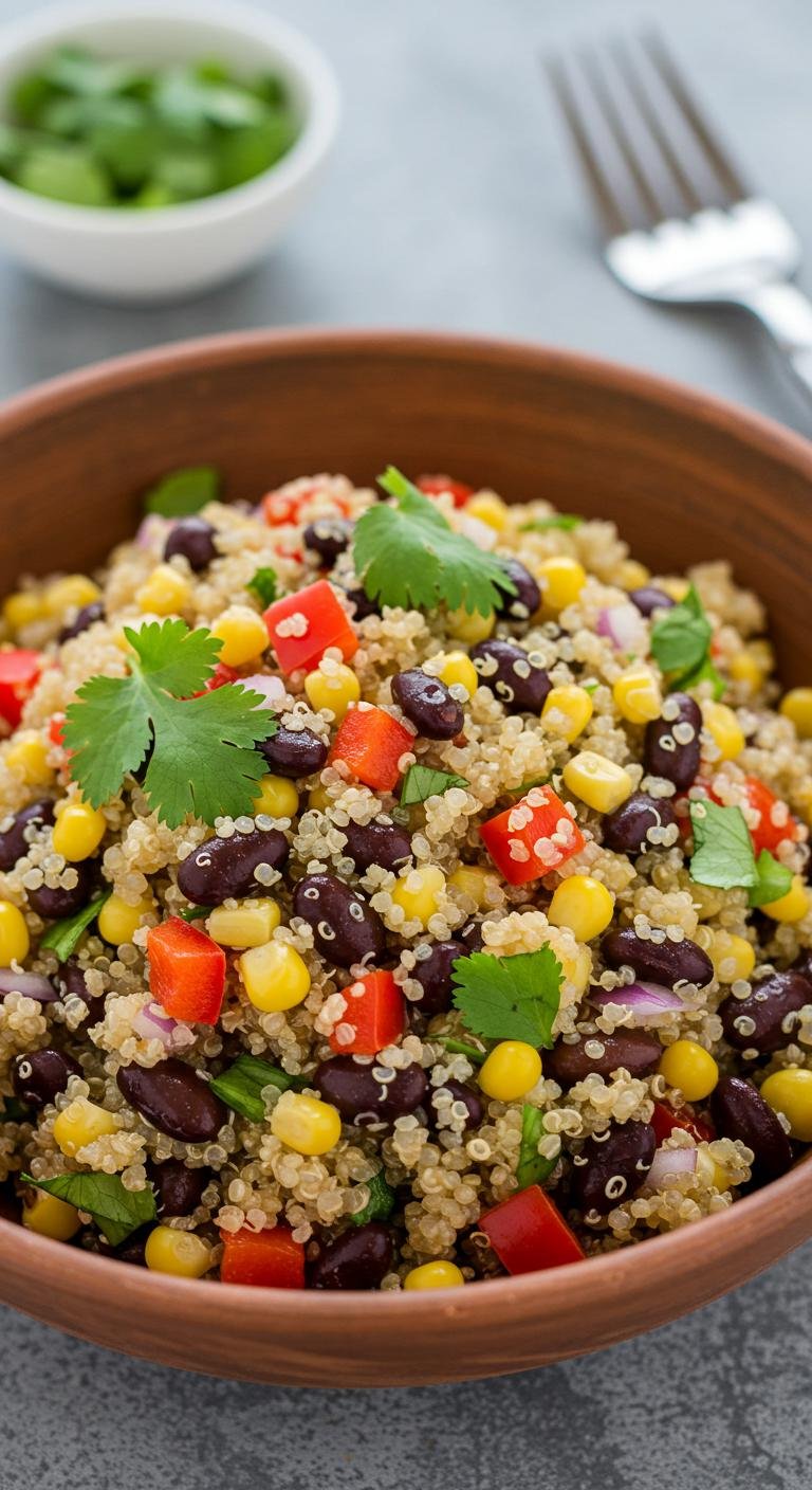 - In a bowl, combine the quinoa, black beans, corn, bell pepper, cilantro, lime juice, salt, and pepper. Mix well.